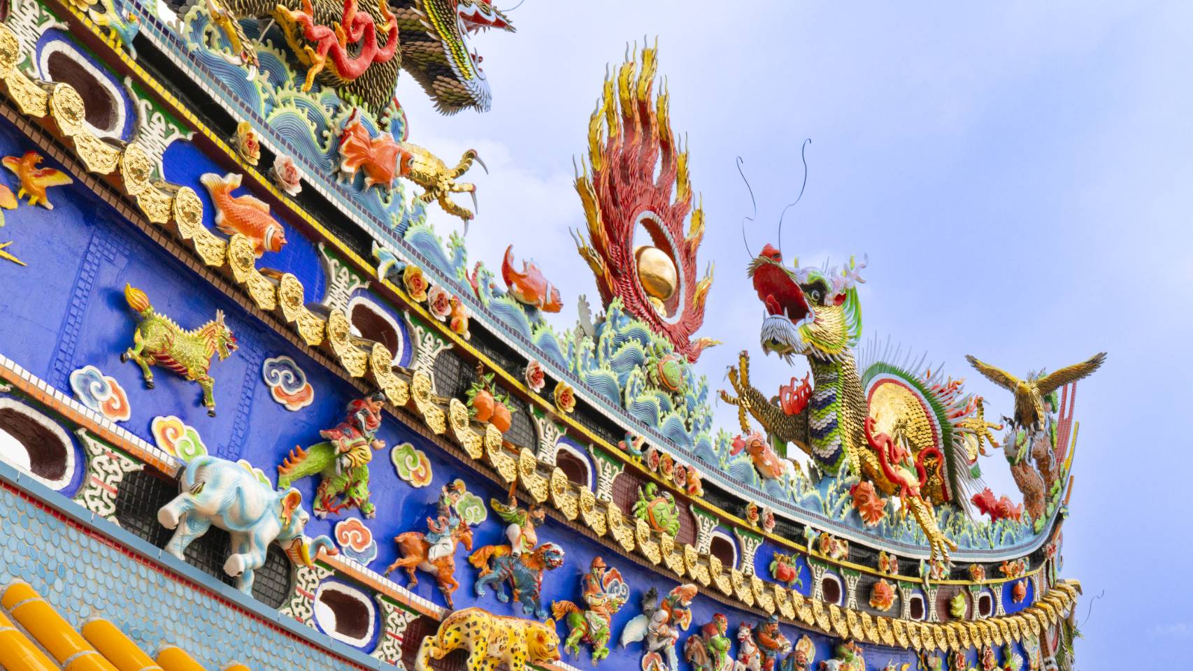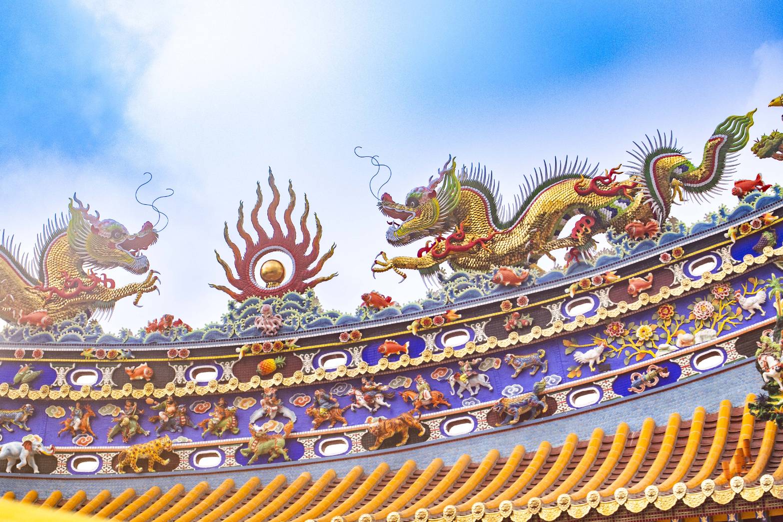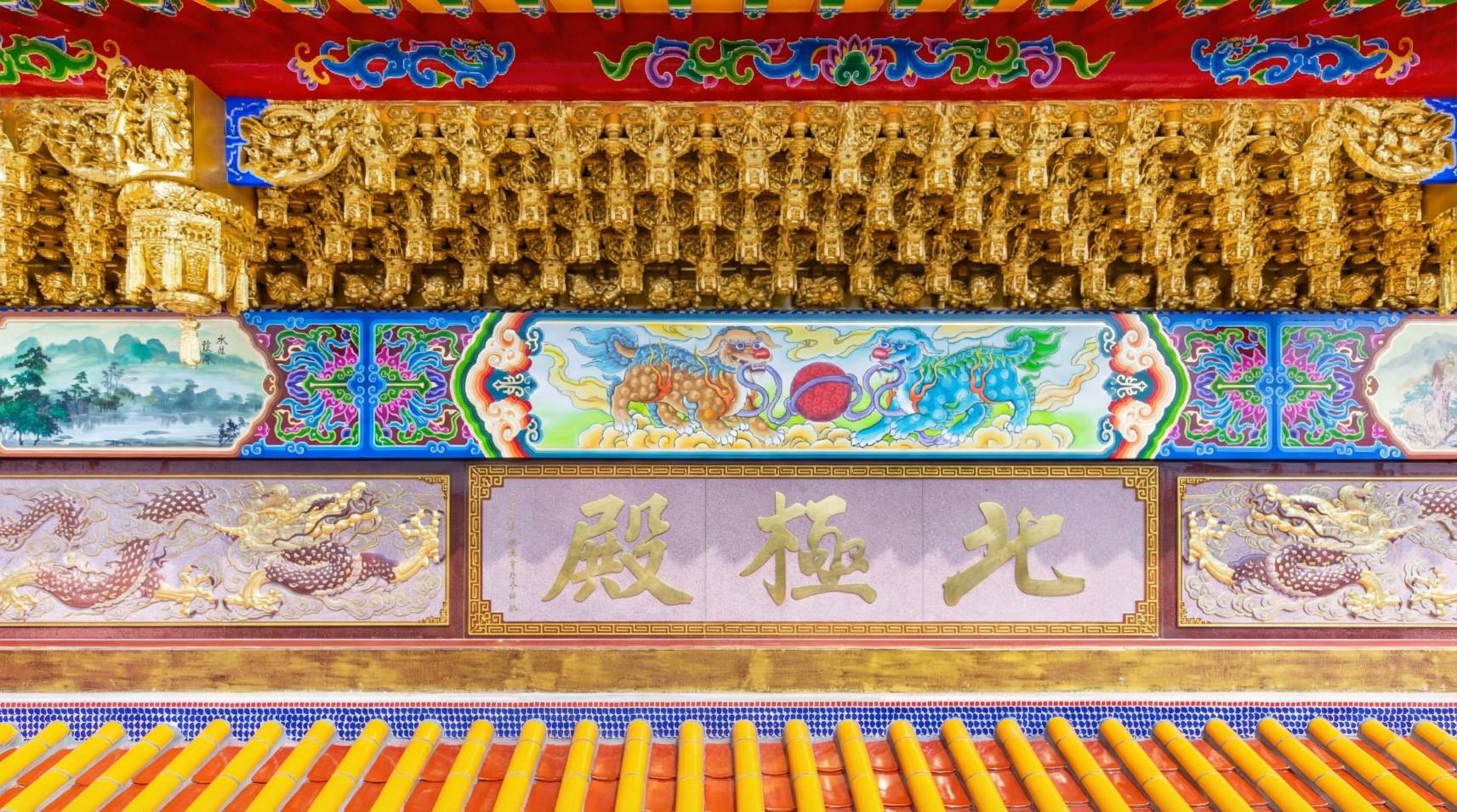 北極殿迎神樓一改傳統廟宇的濃豔色彩,以內斂時尚的風格和精湛的工藝細節著稱。屋脊與構件貼覆金箔,立面大量採用浮雕與陽刻,牌樓屋簷則以陰陽交錯的方式排列,層次分明。滴水石磚鍍以黃金水,在陽光下熠熠生輝,更添靈動。剪黏工藝傳承南式風格,以龍、鳳、鰲、麒麟太子分別象徵天、地、水、人四象,寓意宇宙秩序與生命循環,其中鍍金磁磚打造的雙龍氣勢非凡,象徵天命護佑與王道精神。樓前十尊石獅、麒麟、龍龜等神獸,形成守護陣列,寓意鎮殿護境、八方安泰。